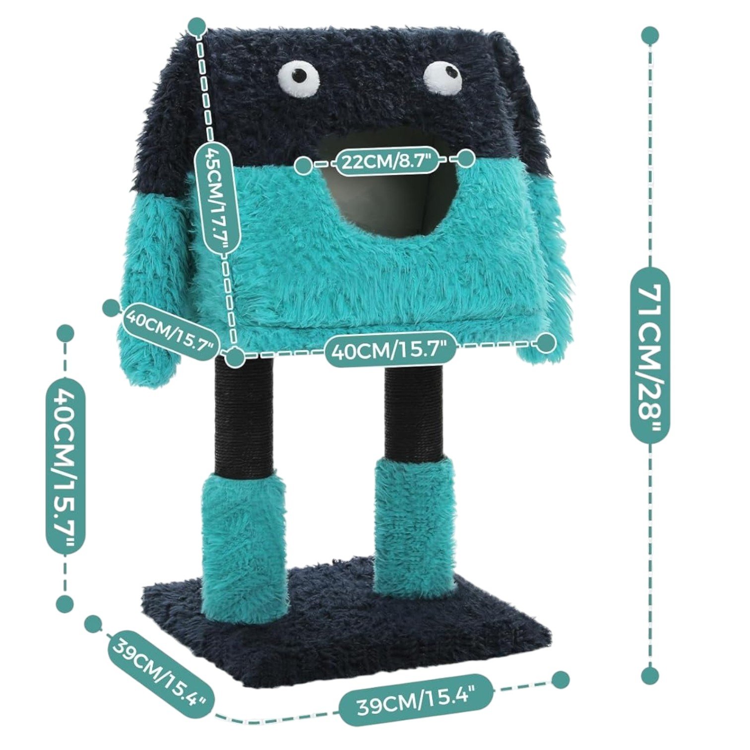 Dimensiuni totale: 71 cm inaltime, 40 × 39 cm baza, 22 cm deschidere casuta